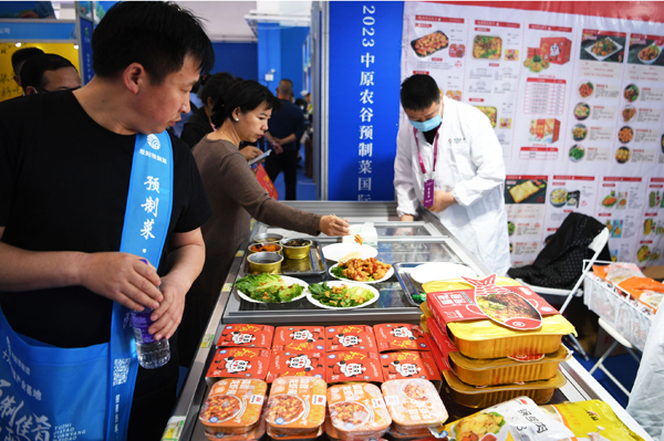 4月10日,參觀者在中原農(nóng)谷預(yù)制菜國際博覽會(huì)上品嘗加工好的預(yù)制食品。