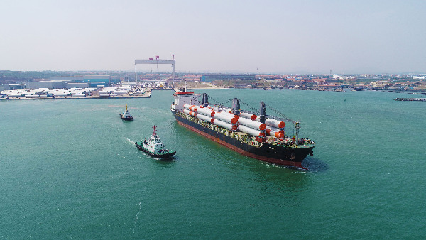 蓬萊高水平建設中國海上風電國際母港,打造海上風電產業(yè)高地,圖為大金重工生產的塔筒運往海外。