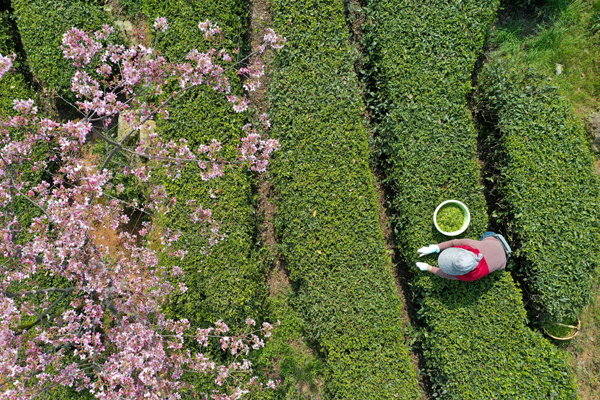 4月11日,村民在福建福鼎市佳陽畬族鄉(xiāng)茶園采茶(無人機照片)。最近,福建省福鼎市的白茶陸續(xù)進入春茶采摘加工期,茶園一派忙碌的景象。