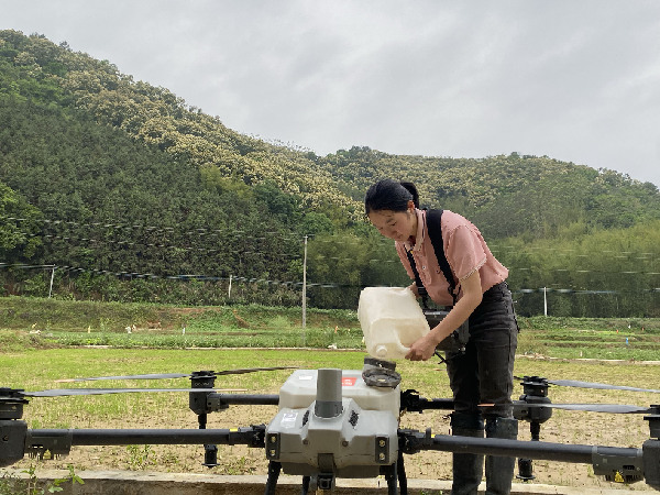 黎穎鈞正在給植保無人機補充藥液。(受訪者供圖)