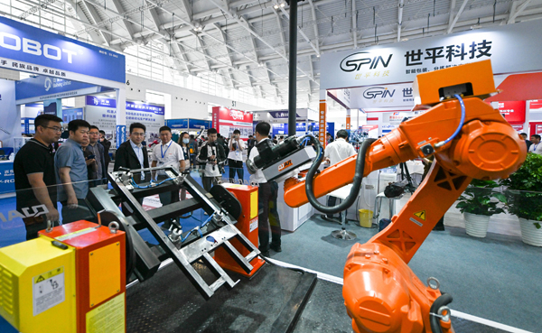 5月8日,在國家會展中心(天津),觀眾參觀展會上展出的工業(yè)設(shè)備。