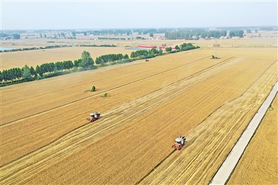 在正陽(yáng)縣付寨鄉(xiāng)章寨村的一片麥田里,數(shù)臺(tái)收割機(jī)分散在各處,加緊搶收小麥。在一塊即將收獲的麥田,章寨村村民蔡勝利頭戴遮陽(yáng)帽、手持鐮刀忙著收割地頭不易被機(jī)收到的小麥,再連穗帶稈平鋪到其它小麥頂部,確保顆粒歸倉(cāng)。