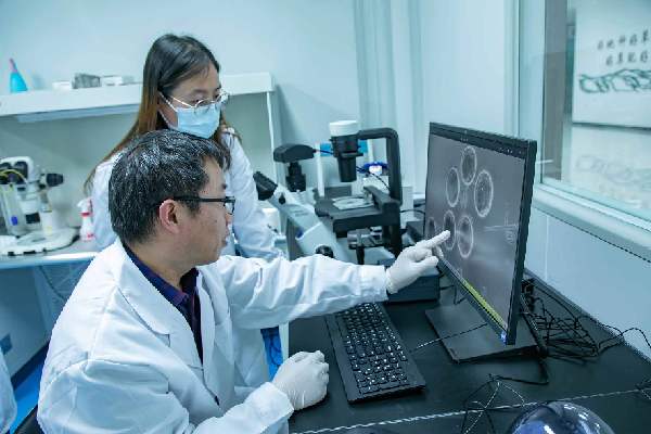 中國(guó)農(nóng)業(yè)科學(xué)院蘭州畜牧與獸藥研究所博士岳耀敬和團(tuán)隊(duì)成員討論羔羊體外胚胎發(fā)育實(shí)驗(yàn)。