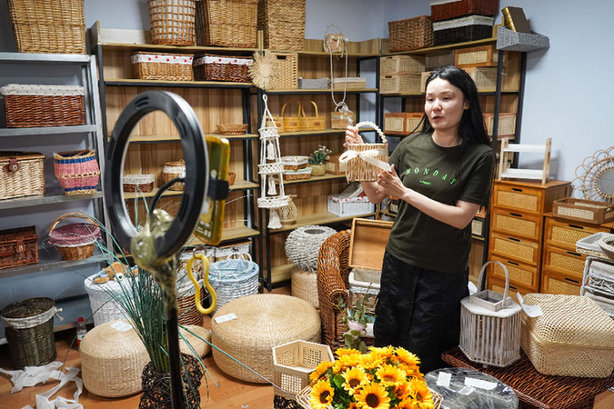 6月6日,臨沂金柳工藝品有限公司員工在電商平臺(tái)銷(xiāo)售柳編產(chǎn)品。