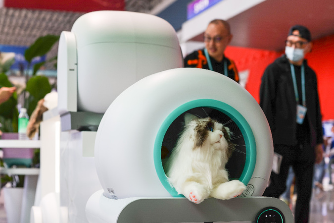 一家中國工業(yè)設(shè)計企業(yè)在第133屆廣交會上展示的全自動貓砂盆等寵物電器。新華社記者 劉大偉 攝