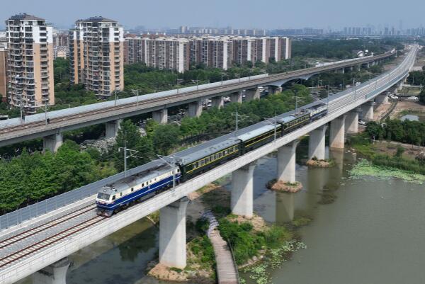 6月15日,檢測列車行駛在滬寧沿江高鐵南京市境內(nèi)的線路上(無人機(jī)照片)。