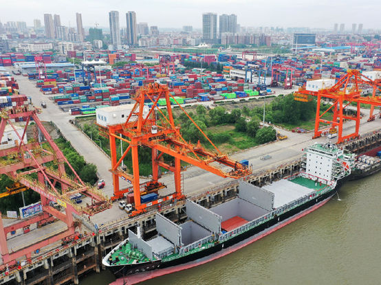 “華航漢亞2號”貨輪??吭谖錆h新港陽邏集裝箱碼頭進行裝箱作業(yè)(2020年5月9日攝,無人機照片)。新華社發(fā)(趙軍 攝)