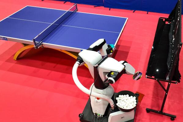 圖為7月22日在成都高新體育中心多功能館拍攝的乒乓球訓(xùn)練機(jī)器人。該設(shè)備通過(guò)模擬人體動(dòng)作發(fā)球,方便接球者對(duì)發(fā)球動(dòng)作進(jìn)行觀察和預(yù)判。同時(shí)可以自定義發(fā)球的速度、旋轉(zhuǎn)和落點(diǎn),針對(duì)訓(xùn)練需求設(shè)定多種打法的訓(xùn)練動(dòng)作體系,幫助運(yùn)動(dòng)員高效精準(zhǔn)調(diào)整訓(xùn)練。