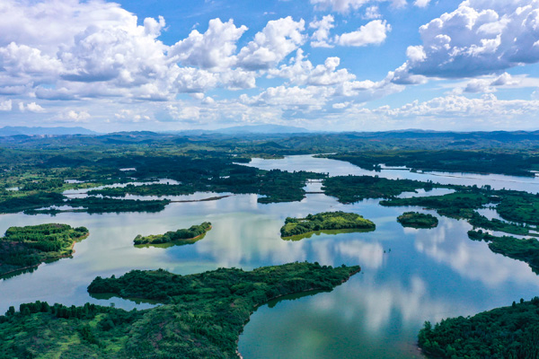 8月6日,湖南桂陽(yáng)舂陵國(guó)家濕地公園,綠水、濕地、藍(lán)天相映成趣,構(gòu)成一幅秀美的夏日生態(tài)畫卷(無(wú)人機(jī)照片)。