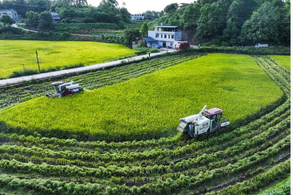 八月十三日在永川區(qū)吉安鎮(zhèn)金門村拍攝的水稻機械化收割作業(yè)現(xiàn)場(無人機照片)。永川區(qū)是重慶市糧食生產(chǎn)主產(chǎn)區(qū)之一,近年來,當?shù)厝媛鋵嵥痉N植補貼政策,統(tǒng)籌推進高標準農(nóng)田建設,大力推廣農(nóng)業(yè)生產(chǎn)機械化,強化農(nóng)業(yè)技術(shù)服務,切實保障糧食安全,促進農(nóng)民持續(xù)增收。新華社記者 王全超 攝