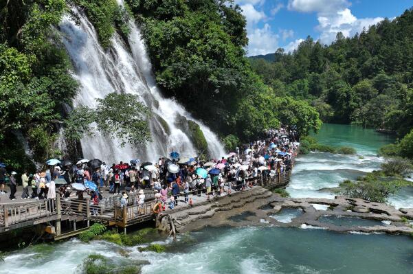 日前,前往貴州省荔波小七孔風景區(qū)游玩的游客激增,景區(qū)各部門通力合作,服務(wù)游客,每天迎客超過6.2萬人次。