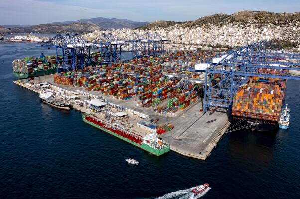 圖為2022年2月19日拍攝的希臘比雷埃夫斯港集裝箱3號碼頭(無人機(jī)照片)。作為“一帶一路”倡議的典范項(xiàng)目,希臘比雷埃夫斯港年貨物吞吐量增至500萬標(biāo)箱以上,躍升為歐洲第四大集裝箱港口、地中海領(lǐng)先集裝箱大港。新華社發(fā)(中遠(yuǎn)海運(yùn)港口比雷埃夫斯碼頭有限公司供圖)