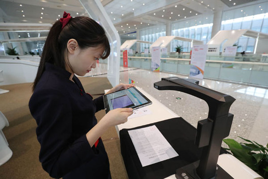 中國(guó)(遼寧)自由貿(mào)易試驗(yàn)區(qū)沈陽(yáng)片區(qū)“渾南會(huì)客廳”內(nèi),工作人員在幫助企業(yè)上傳文件。記者 楊青 攝