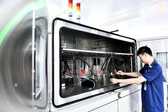 在棗莊市國家鋰電池產(chǎn)品質(zhì)量檢驗檢測中心,工作人員對鋰電池進(jìn)行檢驗。資料照片