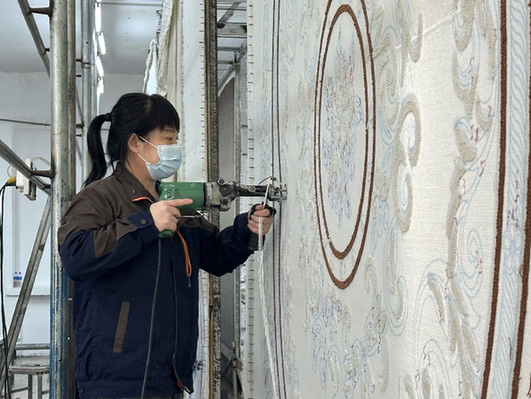 在黑龍江省藍(lán)藝地毯集團(tuán)有限公司的生產(chǎn)車間,一塊塊巨大的底布被展平、固定在半空,工人們有的拿筆對照圖紙?jiān)诓忌献鲋鴺?biāo)記,有的兩手握著電動(dòng)織槍在布上一行行編織,一派忙碌的生產(chǎn)景象。
