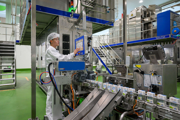 在呼和浩特市伊利現(xiàn)代智慧健康谷液態(tài)奶全球智造標桿基地,工人在生產(chǎn)線上作業(yè)。新華社記者 李志鵬 攝