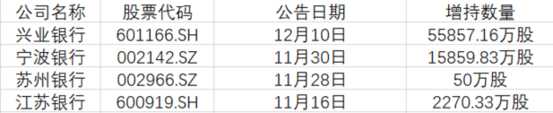 《經(jīng)濟(jì)參考報》記者注意到,11月以來,除興業(yè)銀行外,寧波銀行、蘇州銀行、蘭州銀行等也相繼獲得股東增持。