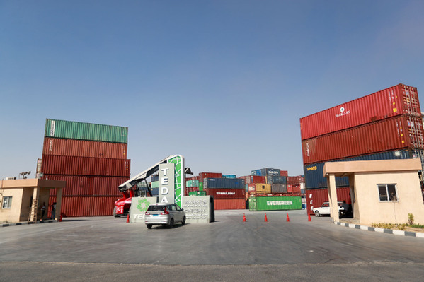 在埃及蘇伊士省的中埃·泰達(dá)蘇伊士經(jīng)貿(mào)合作區(qū)拍攝的泰達(dá)保稅倉(cāng)庫(kù)和二手車交易中心。資料照片