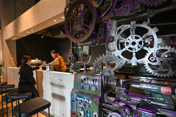 圖為1月3日,產(chǎn)業(yè)會客廳內(nèi)的一家工業(yè)風(fēng)咖啡店在試營業(yè)中?!∮浾摺O凡越 攝