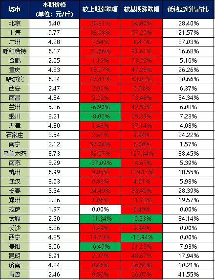 分價(jià)格區(qū)間來看,本期超市食用鹽銷售單價(jià)在5元/斤以上的城市有10個(gè),分別是北京、上海、呼和浩特、哈爾濱、蘭州、烏魯木齊、杭州、長春、長沙、昆明;超市食用鹽銷售單價(jià)在4-5元/斤之間的城市有6個(gè),分別是廣州、重慶、南昌、天津、西寧、濟(jì)南;超市食用鹽銷售單價(jià)在3-4元/斤之間的城市有5個(gè),分別是銀川、石家莊、南京、武漢、貴陽;超市食用鹽銷售單價(jià)在3元/斤以下的城市有7個(gè),分別是合肥、西安、南寧、鄭州、拉薩、太原、青島。