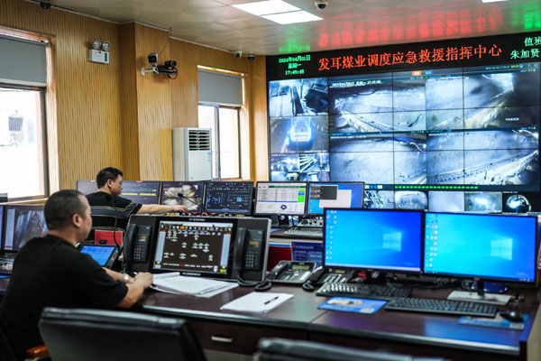 2018年,發(fā)耳煤礦在貴州率先建成智能化綜采工作面,成為貴州省第一家實現(xiàn)綜采工作面智能化、生產(chǎn)輔助系統(tǒng)信息化的礦井。圖為4月1日,發(fā)耳煤業(yè)工作人員在調(diào)度應(yīng)急救援指揮中心工作。記者 陶亮 攝