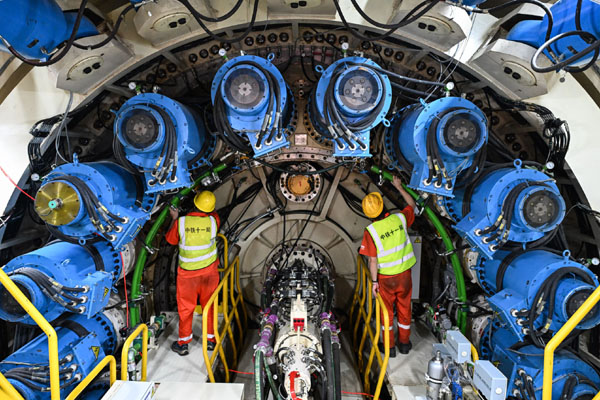 近日,由中鐵十一局承建的深江鐵路深莞隧道西段“鯤鵬號”盾構(gòu)機順利始發(fā)。該段是13米級大直徑單洞雙線隧道,線路埋深跨度在9至62米。深江鐵路是我國“八縱八橫”高鐵網(wǎng)沿海通道的重要組成部分,線路起自深圳西麗站,正線全長116公里,跨越珠江口,串聯(lián)深圳、東莞、廣州、中山和江門等5座城市。該工程建成后,深圳與江門可實現(xiàn)1小時內(nèi)通達,深圳與廣州南沙自貿(mào)片區(qū)可實現(xiàn)半小時高鐵互聯(lián)互通。圖為施工人員在檢查“鯤鵬號”盾構(gòu)機刀頭組件運行狀況。