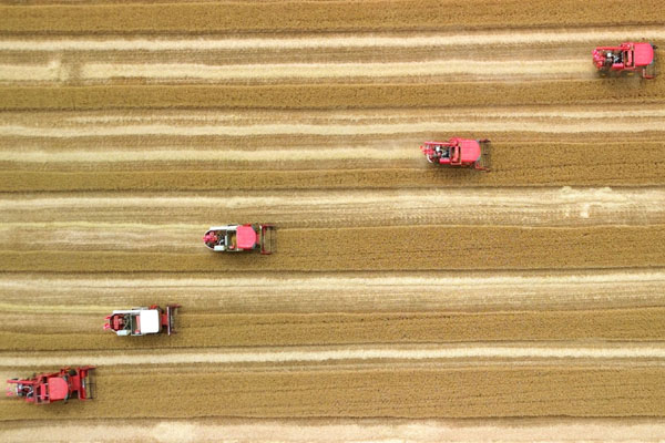 麥浪翻滾,沃野生金。麥田中,10臺收割機依次排開;一聲令下,農(nóng)機手駕駛收割機勻速前行,風(fēng)中搖曳的麥穗被吸入“腹中”,田間只剩下短短的麥茬。