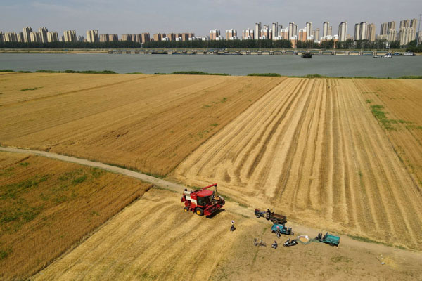 5月29日,在安徽蚌埠市五河縣朱頂鎮(zhèn)淮河岸邊,村民將收割的小麥裝車(無人機照片)。