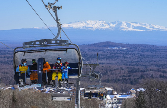 長(zhǎng)白山西坡的萬(wàn)達(dá)滑雪度假區(qū)內(nèi),雪友乘坐纜車上山?!∮浾摺≡S暢 攝
