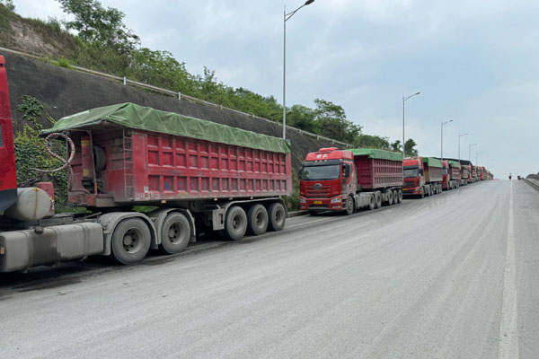 在烏揚(yáng)公用碼頭外等待卸貨的大貨車。記者 程子龍 攝