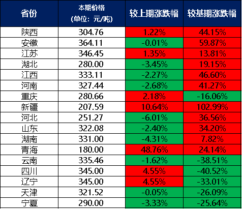 分價格區(qū)間來看,本期兩堿工業(yè)鹽單價在300元/噸及以上的地區(qū)有11個,是陜西、安徽、江蘇、江西、河南、山東、湖南、云南、四川、遼寧、天津;兩堿工業(yè)鹽單價在300元/噸以下的地區(qū)有6個,分別是湖北、重慶、新疆、河北、青海、寧夏。