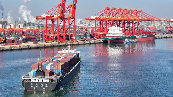 圖為一艘貨輪抵達山東港口日照港集裝箱碼頭(無人機照片)?!⌒氯A社記者 郭緒雷 攝