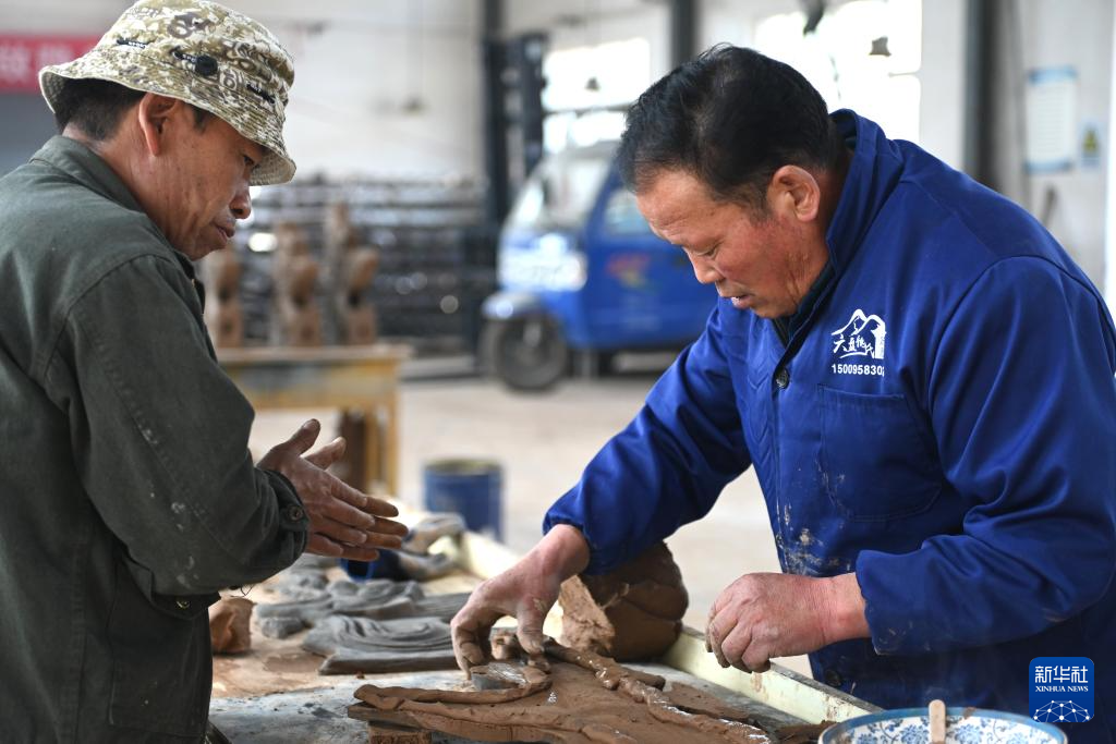 10月30日,在固原市隆德縣魏氏磚雕傳承基地,卜文?。ㄓ遥┰谏a(chǎn)車間對工人進(jìn)行指導(dǎo)。