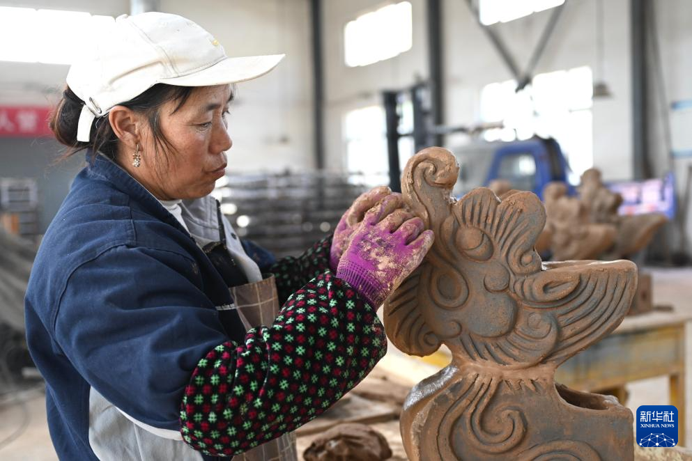 10月30日,在固原市隆德縣魏氏磚雕傳承基地,工人在生產(chǎn)車間制作磚雕。