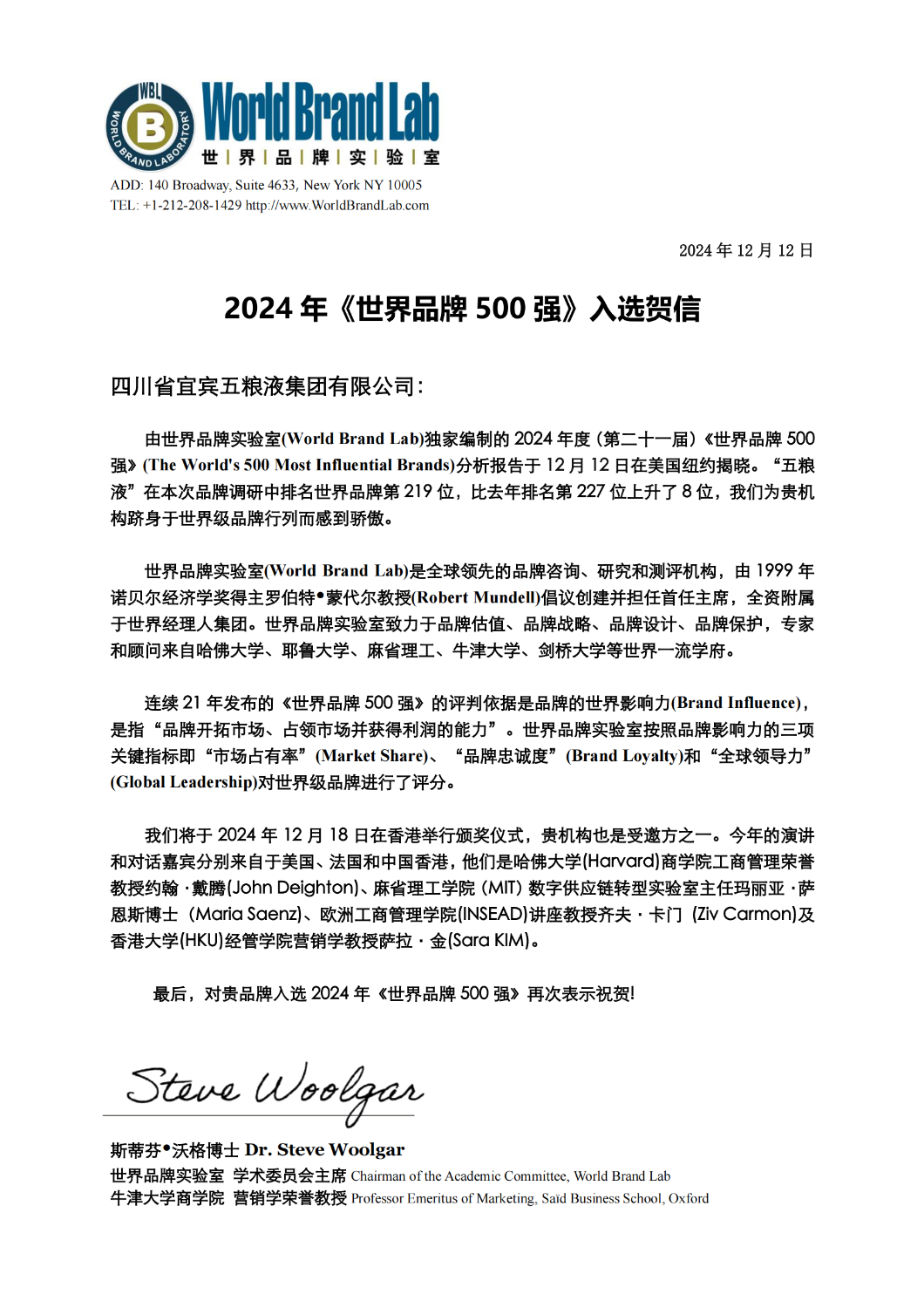 美國當(dāng)?shù)貢r間12月12日,世界品牌實驗室于美國紐約發(fā)布了2024年度《世界品牌500強》榜單。五糧液連續(xù)第八年榮登榜單,品牌排名增幅位居白酒行業(yè)第一。作為白酒領(lǐng)軍企業(yè),五糧液以豐富形式持續(xù)提升品牌知名度和美譽度,不斷推動中國白酒文化的國際化傳播,加深全球消費者對中國傳統(tǒng)文化的理解與欣賞,成為中國品牌在國際舞臺的一張亮麗名片。