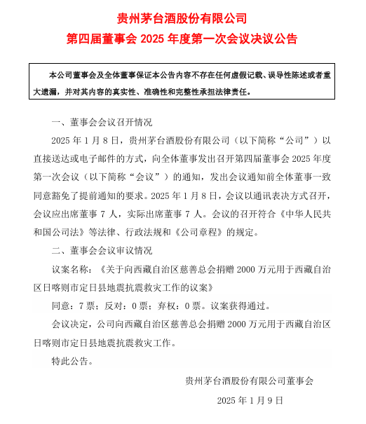地震發(fā)生后,貴州茅臺第一時(shí)間啟動(dòng)救災(zāi)響應(yīng),于1月8日召開第四屆董事會2025年度第1次會議,做出以上決定。