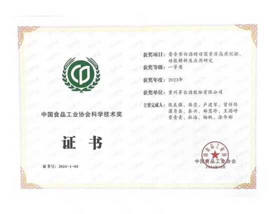 茅臺(tái)酒股份公司科創(chuàng)成果獲中國(guó)食品工業(yè)協(xié)會(huì)科學(xué)技術(shù)獎(jiǎng)一等獎(jiǎng)