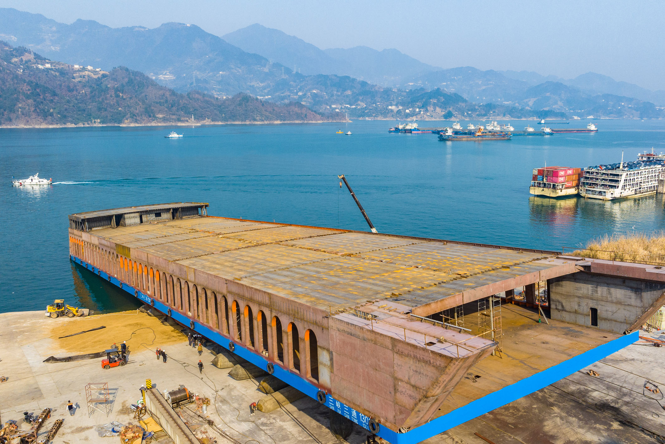 三峽庫區(qū)首艘新能源滾裝船近日在湖北省秭歸縣華星船務(wù)有限公司順利下水。該貨輪是三峽集團(tuán)聯(lián)合交通運(yùn)輸部長江航務(wù)管理局共同打造的新能源運(yùn)用試點(diǎn)示范船舶,設(shè)計(jì)載重8000多噸,采用“甲醇單一燃料發(fā)電+電力驅(qū)動(dòng)”動(dòng)力系統(tǒng)。圖為秭歸縣華星船務(wù)有限公司建造的新能源滾裝船從制造平臺(tái)向江上移動(dòng)。