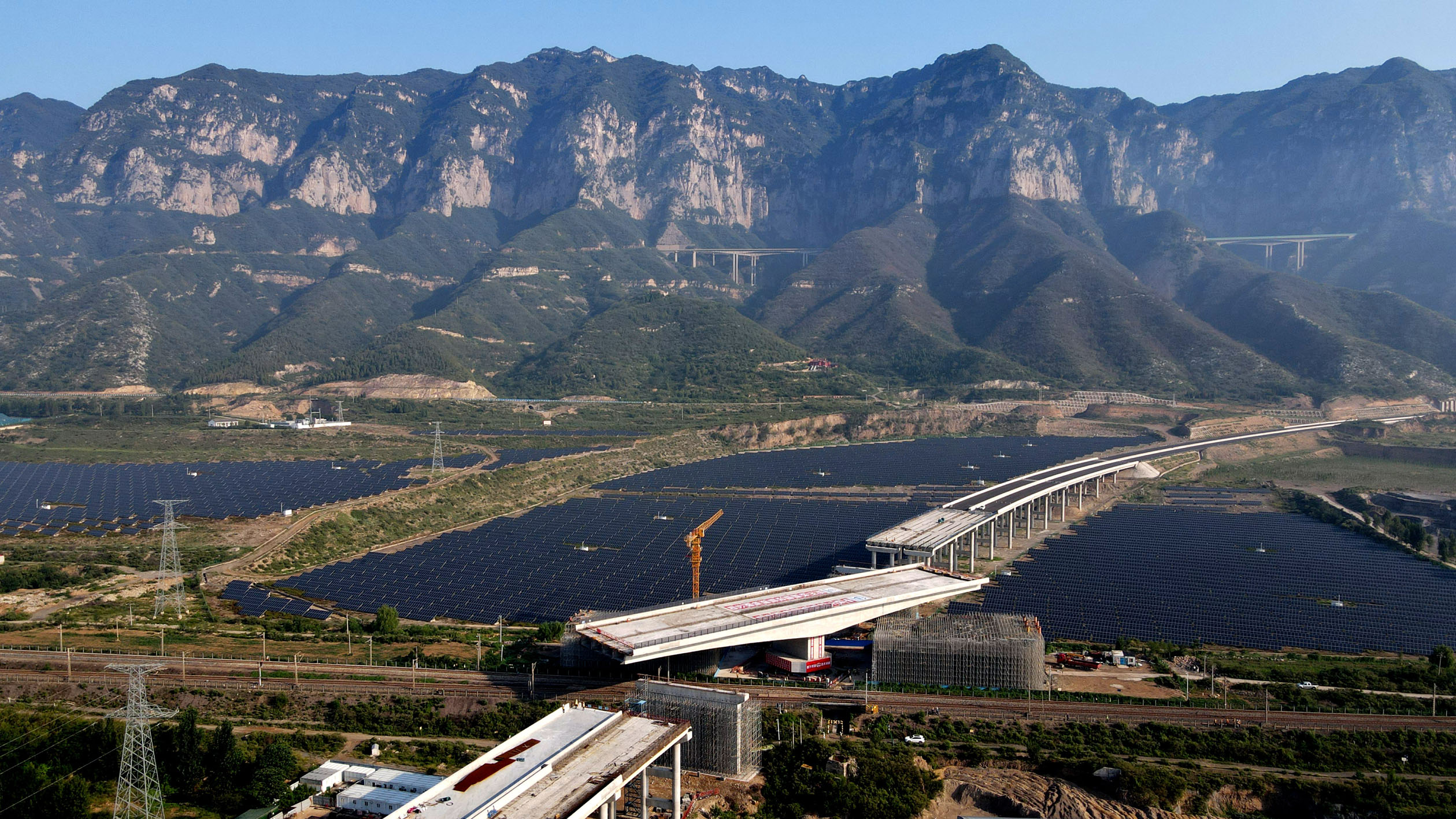 這是8月11日拍攝的河南省濟源市沿太行山高速公路跨焦柳鐵路立交橋轉(zhuǎn)體施工現(xiàn)場(無人機照片)。當日,由中鐵大橋局承建的河南省濟源市沿太行山高速公路上跨焦(作)柳(州)鐵路立交橋成功轉(zhuǎn)體。轉(zhuǎn)體主梁總長130米,總重量達2.1萬噸。新華社記者 朱祥 攝
