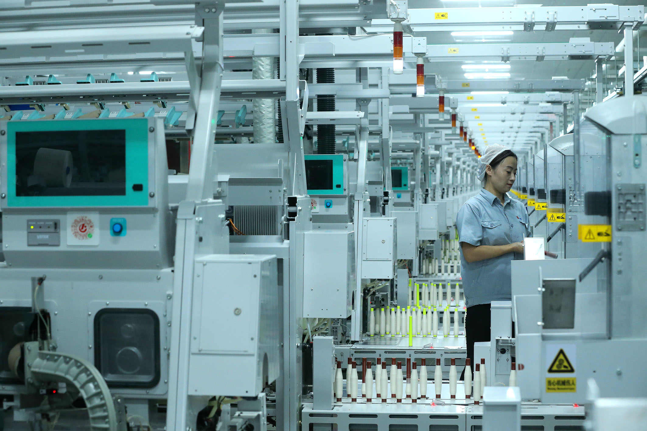圖為青島市即墨區(qū)一家科技紡織企業(yè)的工人在智慧紡紗生產(chǎn)線上工作。 新華社發(fā)(梁孝鵬 攝)