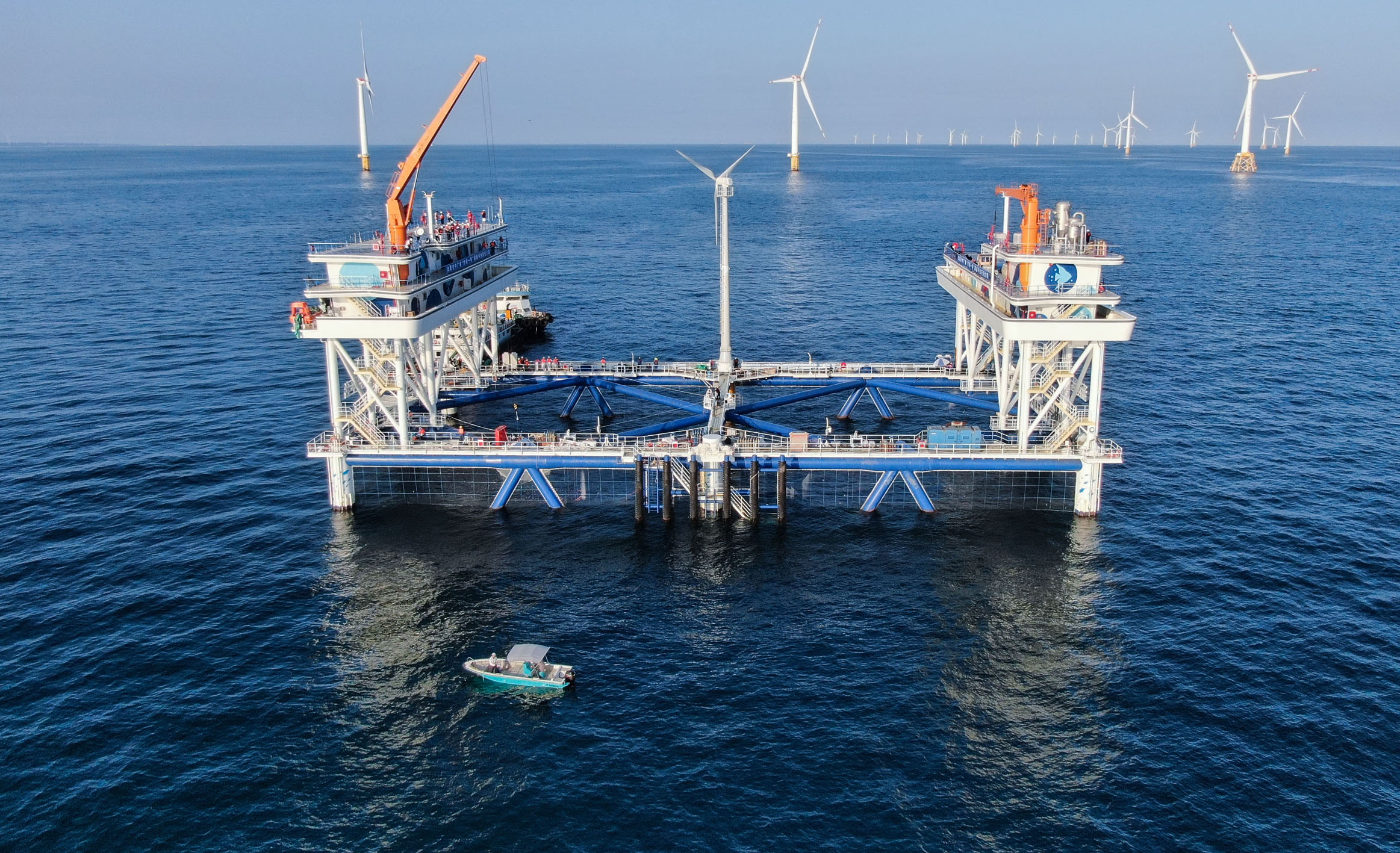 這是在廣東汕尾拍攝的中廣核“伏羲一號(hào)”風(fēng)漁融合網(wǎng)箱平臺(tái)(無人機(jī)照片)。新華社記者 鄧華 攝