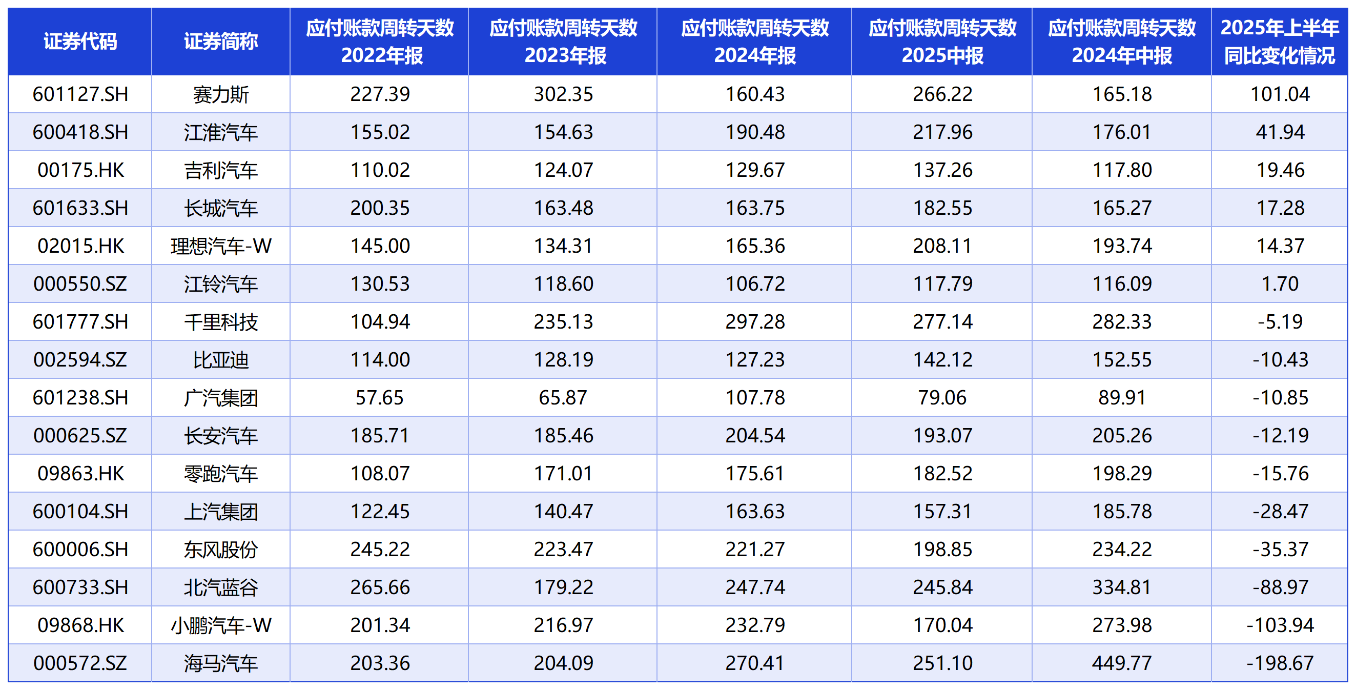 從應(yīng)付賬款周轉(zhuǎn)角度來(lái)看,今年上半年,16家車(chē)企中有10家車(chē)企應(yīng)付賬款周轉(zhuǎn)天數(shù)較2024年同期減少,車(chē)企數(shù)量占比為62.5%。長(zhǎng)城汽車(chē)、理想汽車(chē)、賽力斯等車(chē)企應(yīng)付賬款周轉(zhuǎn)天數(shù)同比均增加。特別是賽力斯,今年上半年的應(yīng)付賬款周轉(zhuǎn)天數(shù)為266.22天,較2024年同期的165.18天增加了101.04天,其增幅位居16家車(chē)企之首。