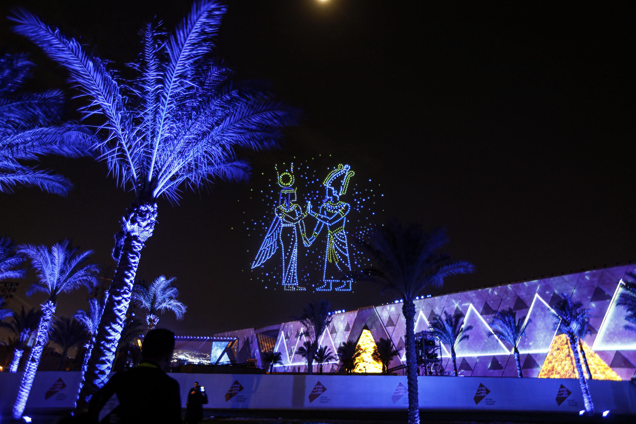 圖為在埃及吉薩拍攝的開館儀式上的無人機表演和燈光秀。
