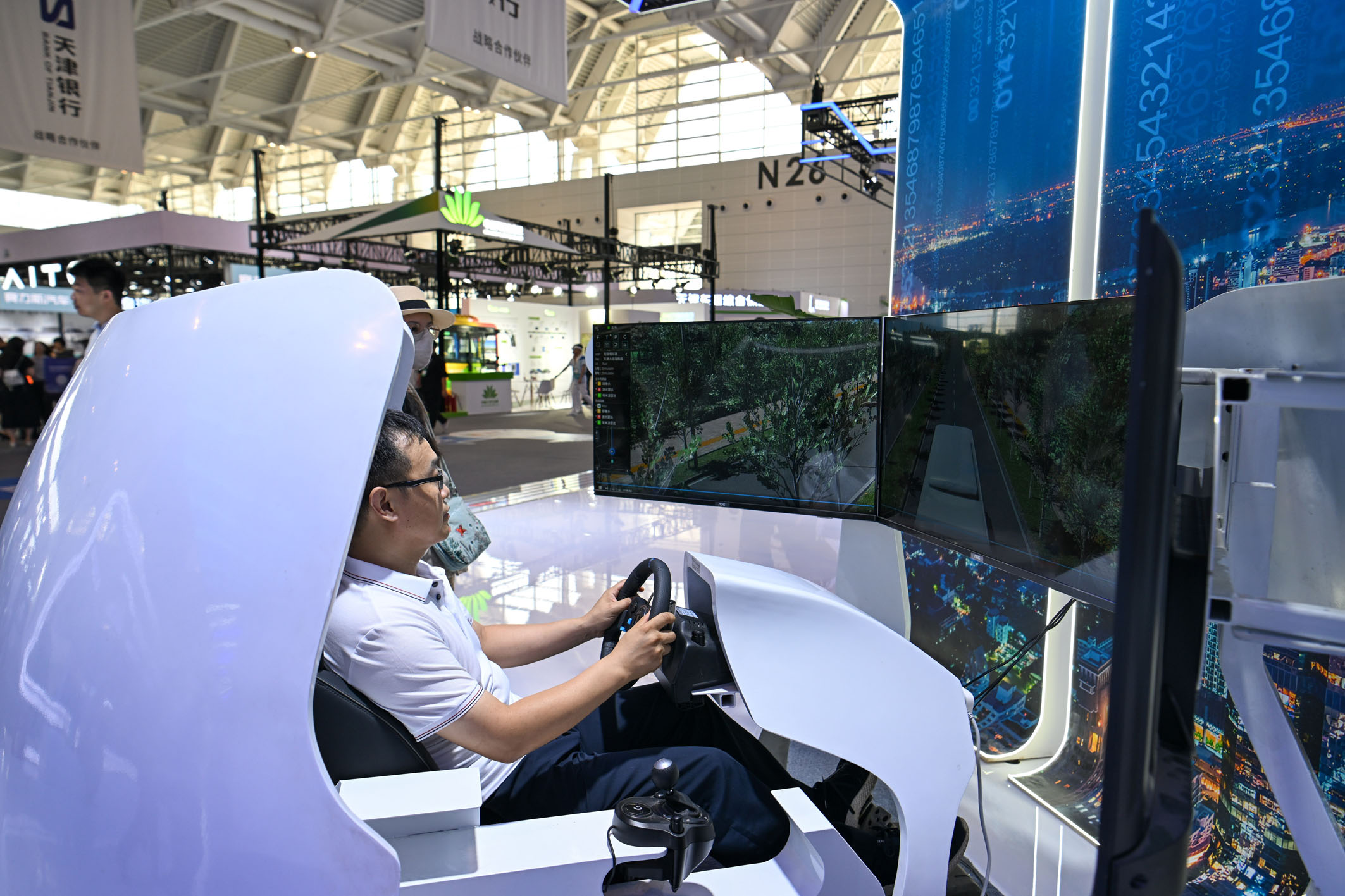 圖為參觀者在展會現(xiàn)場體驗天津大學(xué)設(shè)計研發(fā)的一款可進行多場景智能網(wǎng)聯(lián)車測試的仿真模擬器。(資料照片)