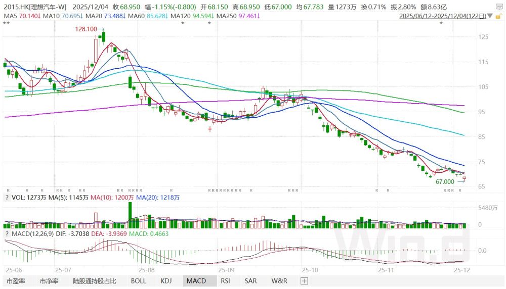 圖:理想汽車近期股價持續(xù)下跌 資料來源:Wind
