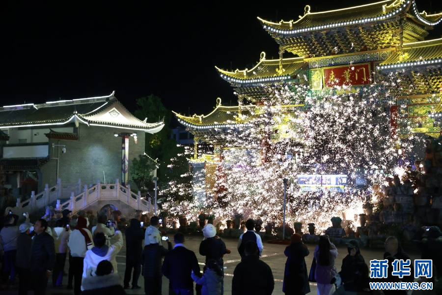 嶍峨古鎮(zhèn)上的焰火表演(2025年11月28日攝)。新華網(wǎng)發(fā)(楊楨宇 攝)