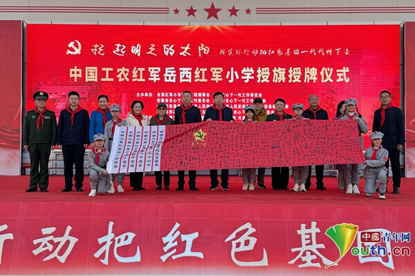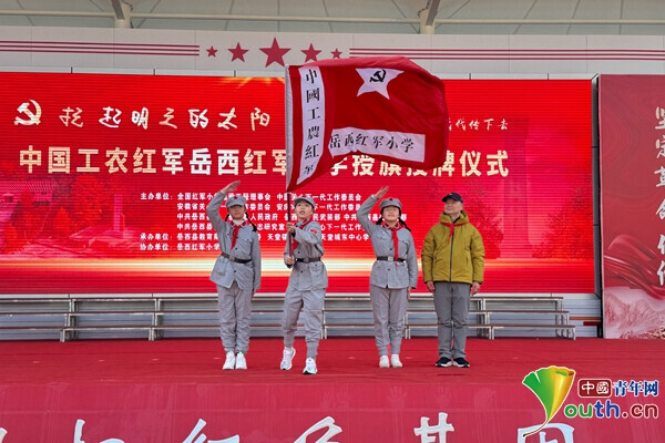 向安徽岳西紅軍小學(xué)授中國(guó)工農(nóng)紅軍軍旗。