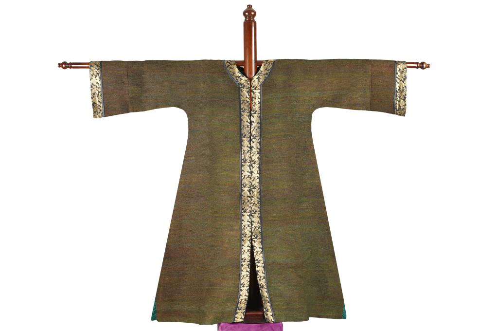 復(fù)古的中式制式大氅已經(jīng)足以驚艷,而閃耀著孔雀羽黛藍漸變色、由金絲編織的錦緞衣料,那么如夢如幻,炸裂一樣的張力滿足了關(guān)于“錦衣華服”的想象。