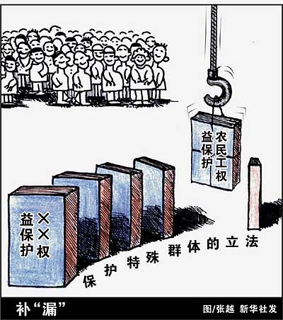 目前,全國農(nóng)民工數(shù)量有1.5億人,依法保護(hù)他們的合法權(quán)益是構(gòu)建和諧社會(huì)重點(diǎn)內(nèi)容。兩會(huì)期間代表委員們建議,應(yīng)盡快制定出臺(tái)農(nóng)民工權(quán)益保護(hù)法,從根本上為農(nóng)民工依法維權(quán)提供法律上、制度上的保障。 代表委員們同時(shí)指出,這部法律應(yīng)當(dāng)確立農(nóng)民工的正當(dāng)社會(huì)地位,明確規(guī)定農(nóng)民工合法勞動(dòng)報(bào)酬不受侵犯;農(nóng)民工在城市的集體住所和私人住所不受侵犯;農(nóng)民工及其家人能真正享有普通城市公民一樣的城市生活等一系列合法權(quán)益。 |