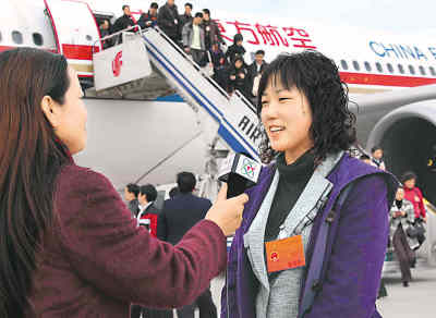 3月2日,出席十一屆全國(guó)人大一次會(huì)議的代表陸續(xù)抵達(dá)北京。 出席十一屆全國(guó)人大一次會(huì)議的甘肅代表團(tuán)抵達(dá)北京。新華社記者 王建華 攝